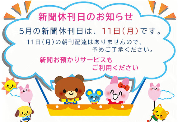 【休刊日のお知らせ】 11月の新聞休刊日は、10日(月)です。 10日(月)の朝刊配達はありませんので、予めご了承ください。 【ご利用ください 新聞お預かりサービス】 ご旅行やご出張等でお留守にしている間の新… 【休刊日のお知らせ】4月の新聞休刊日は、13日(月)です。13日(月)の朝刊配達はありませんので、予めご了承ください。